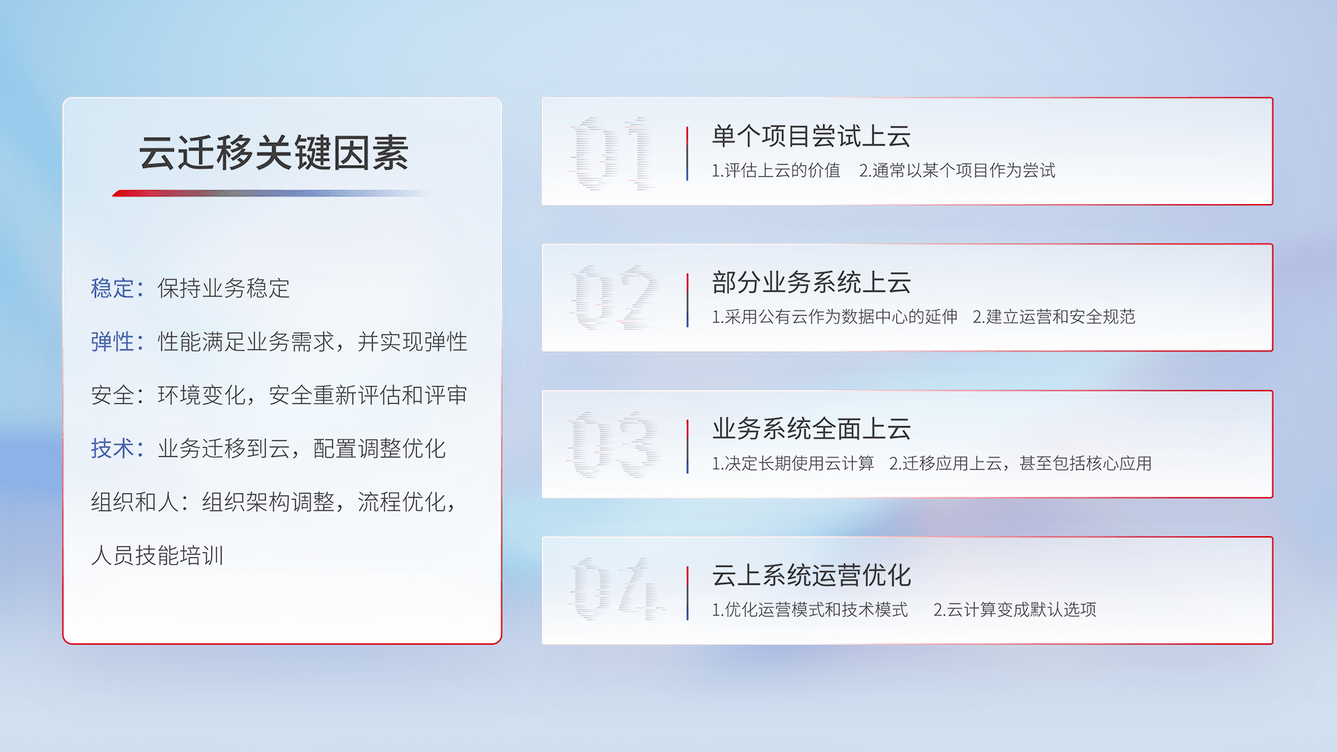 结合实际业务,,,从规划设计、、、、云平台选型、、云原生改造、、、、数据迁移、、、、集成交付,,,,迁移全过程为客户识别最佳上云路径,,,做好风险识别管理,,,,设计网络架构、、身份权限、、、安全审计合规、、操作审计、、日志审计、、监控告警策略、、多站点容灾设计等,,,对云上基础设施进行整体规划,,,提升IT治理水平,,以满足弹性、、、、高可用、、高性能的需求。。。