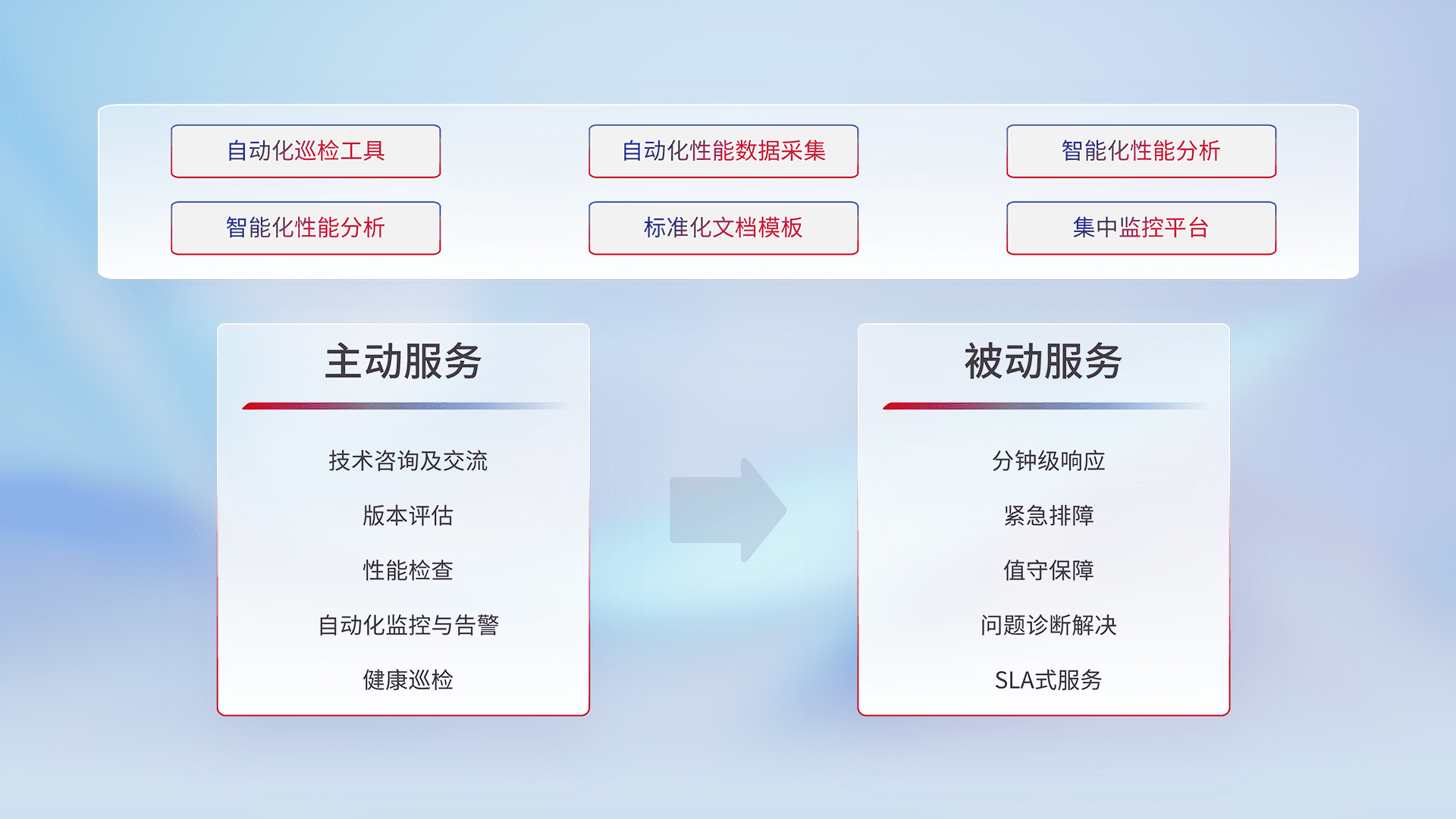 智能化工具和标准化文档,,保障服务质量,,提供主动服务(包含技术咨询、、、版本评估、、、性能检查、、自动化监控与告警、、健康巡检)和被动服务包含(分钟级响应、、紧急排障、、值守保障、、、、问题诊断解决、、、、SLA服务)。。